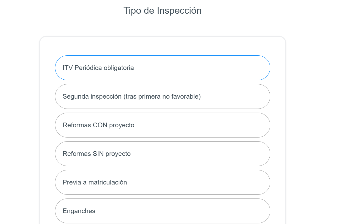 El segundo paso es elegir el tipo de inspección que vas a realizar, luego, tipo de vehículo y tipo de transmisión.