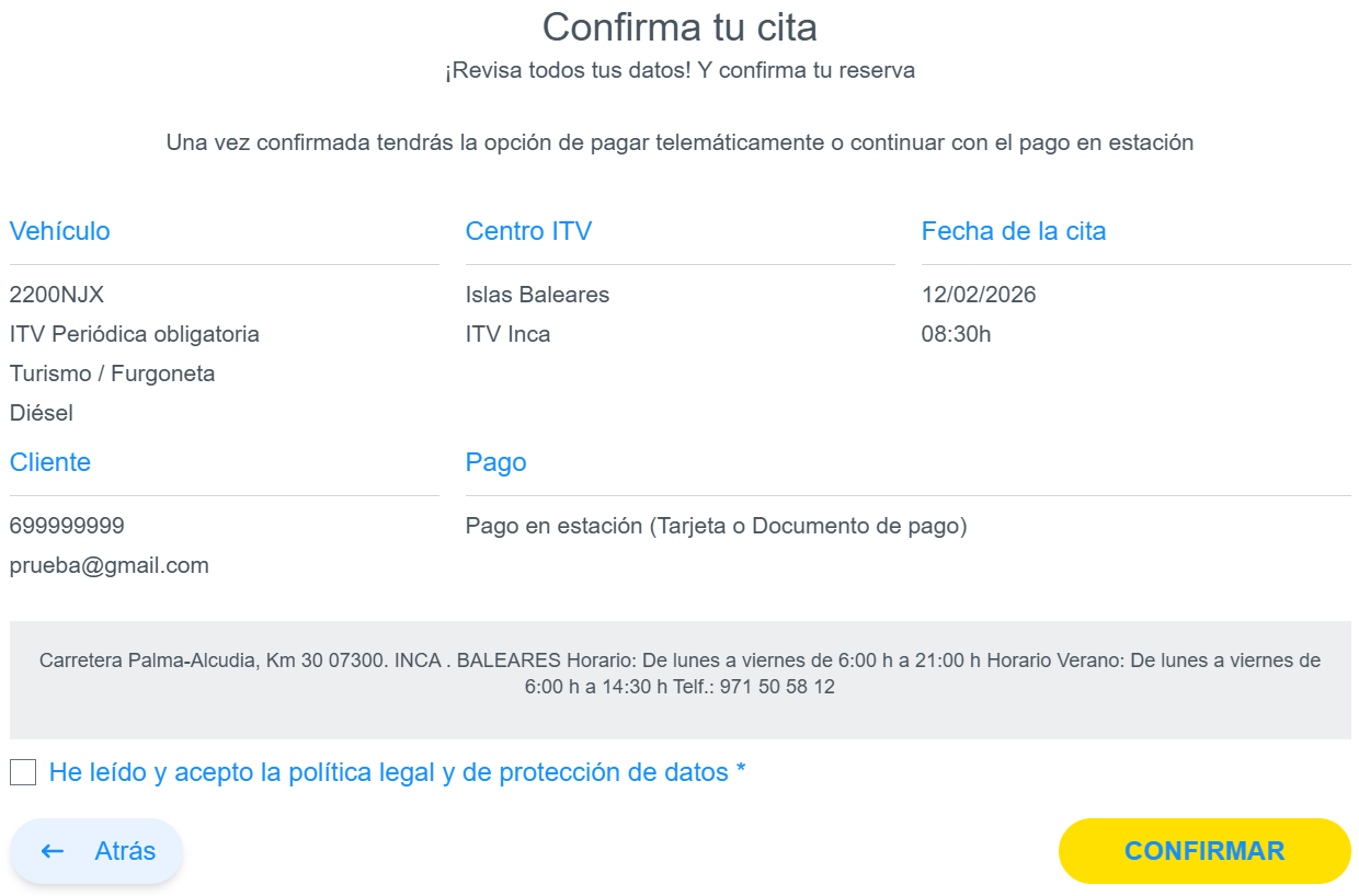 Séptimo y último paso. Revisa que todos los datos sean correctos y apúntate en tu calendario el día de la revisión. El pago se realiza en la estación o en el siguiente paso podrás realizar el pago.
